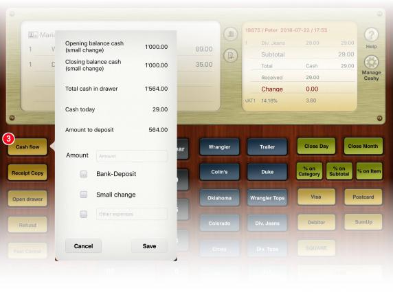 • “Total cash in drawer“ : Shows the sum of „Small cash“ plus the cash sales accumulated over time