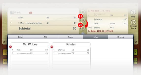 A long tap onto one of the users buttons will print a short report containing the amounts of the different  payment methods cashed from this seller/user since last close-day in ‚Z‘-mode