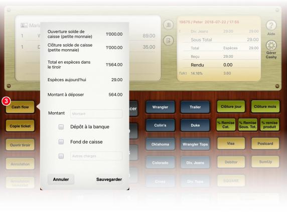 Dans la fenêtre pop-up vous pouvez gérer toutes les actions liées à l’argent comptant telles que: