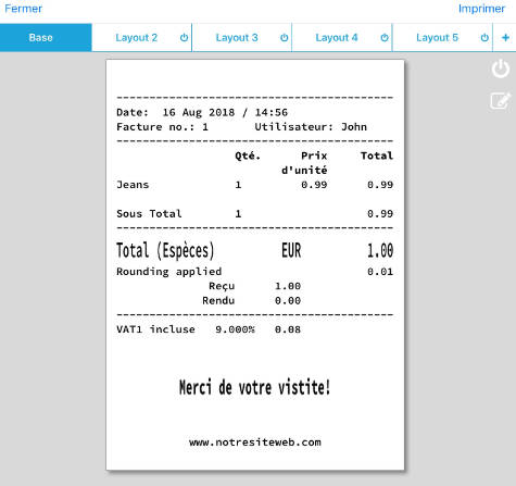 Chaque layout du ticket de caisse put être personnalisé complètement selon vos vœux.