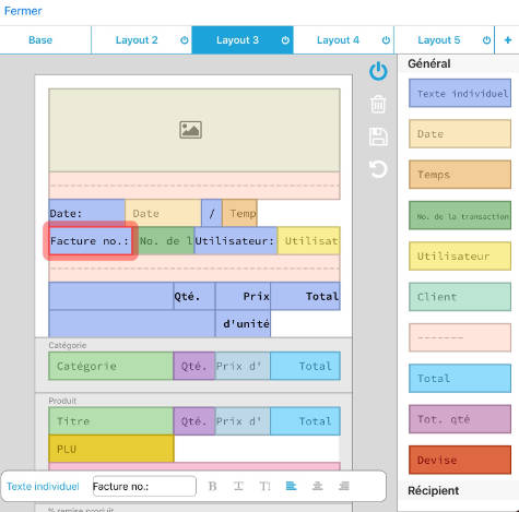 — Pour effacer un bloc ou un champ, tirez-le en dehors du reçu. La taille d’un champs peut être adapté en le touchant sur sa bordure et ensuite glissant droit ou gauche.