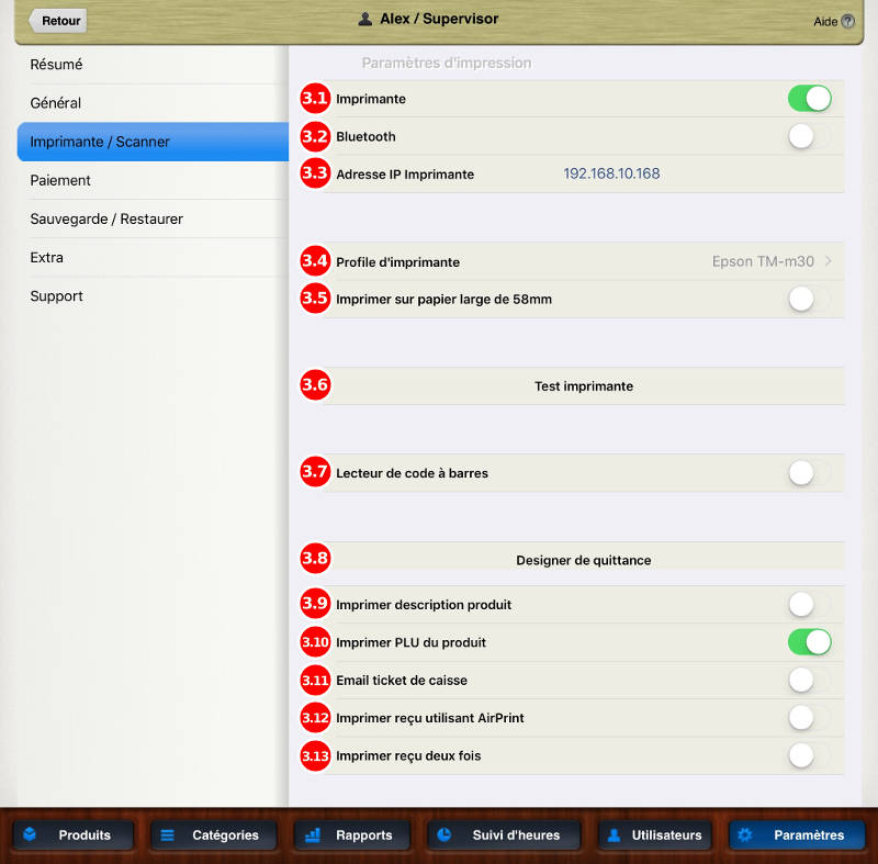 En activant cet option vous pouvez imprimer des reçu ainsi que des rapports sur une imprimante de bureau équipée de la technologie “AirPrint“.