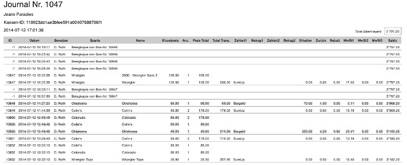 Journal/Cash book: At Close-day a journal containing detailed transactions is attached to the email. Cash payments are sumed-up and carried over to the next day